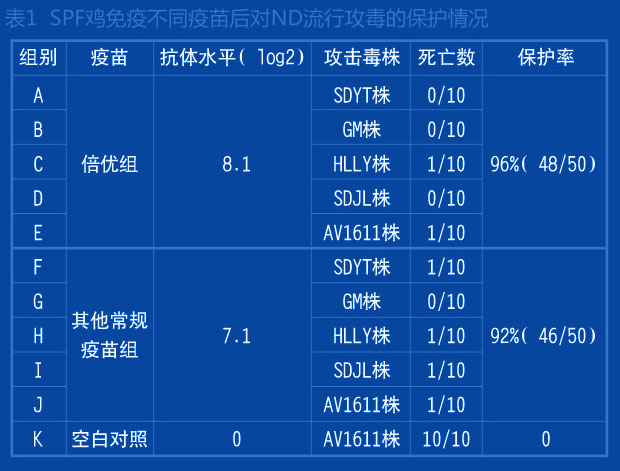 在實驗室條件下,SPF雞7日齡一次免疫倍優系列產品(ND+H9 ) 0.1ml ,免疫后21天采用各地分離的流行ND毒株(基因VII型)進行攻毒, 倍優組的攻毒保護為96%(表1)。