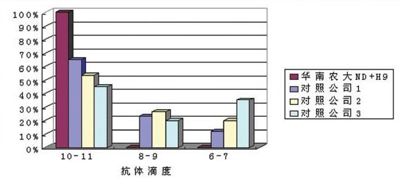 華南農業大學獸醫學院針對近年國內流行H9毒株和新城疫強毒作分析比較,挑選山東、河南、河北、廣西等 有代表性的禽流感H9N2病毒和新城疫強毒各近100株作為攻擊病毒,分別以上述病毒攻擊以用廣州市華南農大生物藥品有限公司精品系列油苗一ND+H9和國內其他廠家的疫苗免疫的試驗雞,計算發病雞數量,統計不同疫苗之間的保護率,發現廣州市華南農大生物藥品有限公司生產的精品系列油苗一ND+H9對上述攻擊野毒都有較好的保護作用。