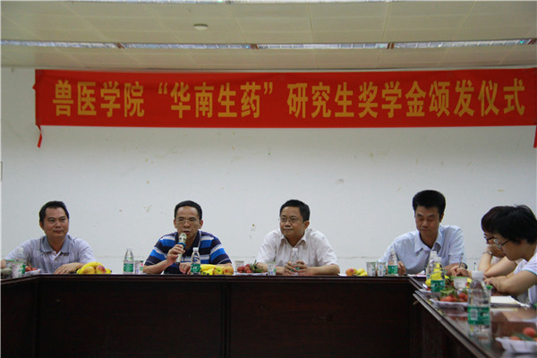 活動首先由梁梓森書記代表學(xué)院致辭,衷心感謝廣州市華南農(nóng)大生物藥品有限公司在獸醫(yī)學(xué)院設(shè)立研究生獎學(xué)金勉勵獸醫(yī)學(xué)子勤奮學(xué)習(xí)、進(jìn)取有為,并對獲獎同學(xué)表示祝賀,希望同學(xué)們能再接再厲,不辜負(fù)企業(yè)與學(xué)院的期望。此外,梁書記還結(jié)合華南生藥兩位總經(jīng)理的創(chuàng)業(yè)經(jīng)歷給大家上了一堂簡短生動的創(chuàng)業(yè)培訓(xùn)課,在啟發(fā)同學(xué)們開拓個(gè)人發(fā)展的同時(shí)也祝愿華南生藥公司的發(fā)展越來越好。企業(yè)代表梁昭平總經(jīng)理向大家介紹了華南農(nóng)大生物藥品有限公司的基本情況,并介紹了企業(yè)來學(xué)院設(shè)立獎學(xué)金的初衷是以關(guān)注研究生個(gè)人發(fā)展為出發(fā)點(diǎn),通過設(shè)立獎學(xué)金為紐帶增進(jìn)校企間的科技、文化交流,進(jìn)而深化產(chǎn)學(xué)研合作的形式,實(shí)現(xiàn)校企優(yōu)勢互補(bǔ)、互利共贏,希望同學(xué)們以獲得獎學(xué)金資助為鞭策,加倍努力規(guī)劃好自己的學(xué)業(yè)和能力。