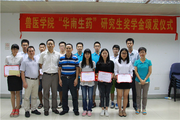 2015年6月24日下午3:30,“華南生藥”研究生獎學(xué)金頒獎暨揭牌儀式在農(nóng)業(yè)部畜禽產(chǎn)品質(zhì)量監(jiān)督檢驗(yàn)測試中心101報(bào)告廳舉行。廣州市華南農(nóng)大生物藥品有限公司梁昭平總經(jīng)理、營銷中心黃國城副總經(jīng)理、公司技術(shù)部李敏經(jīng)理、行政拓展部許芬芬經(jīng)理、我校獸醫(yī)學(xué)院黨委書記梁梓森、黨委副書記楊利江、輔導(dǎo)員陳曉梅老師、全體獲獎學(xué)生和學(xué)生代表出席并參加了掛牌儀式和頒獎典禮。