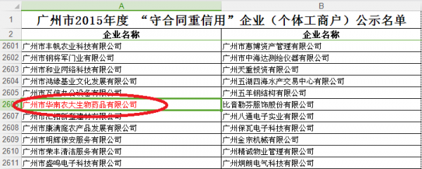 根據廣東省工商行政管理局《關于印發廣東省守合同重信用企業公示活動規則的通知》(粵工商市字〔2009〕697號)和廣州市工商行政管理局《關于守合同重信用公示活動有關問題的通知》(穗工商合〔2013〕209號)精神,經廣州各行業協(商)會推薦,并征求各有關部門的意見,認為廣州市華南農大生物藥品有限公司符合廣州市2015年度 “守合同重信用”公示條件。