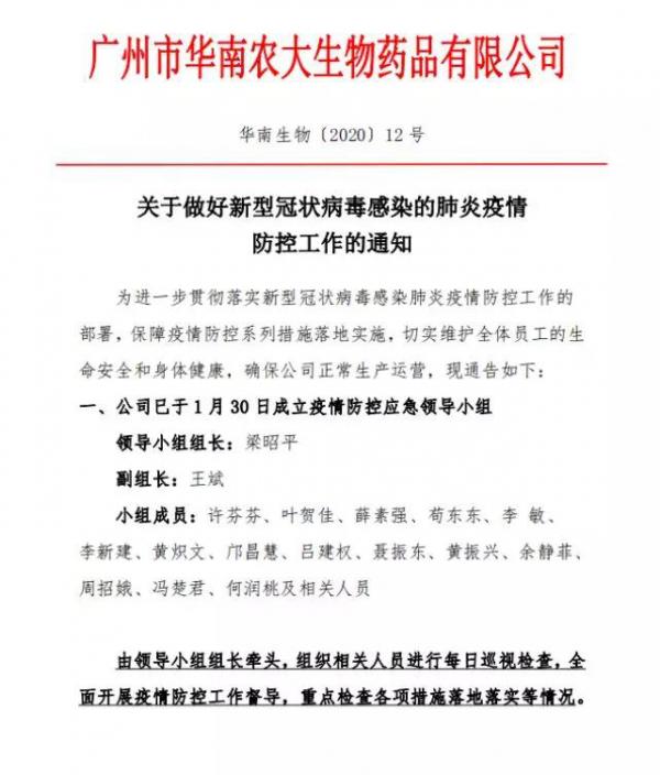 2020年2月12日,增城區(qū)委副書(shū)記、增城區(qū)區(qū)長(zhǎng)趙國(guó)生帶領(lǐng)增城區(qū)科工商信局一行5人,蒞臨廣州市華南農(nóng)大生物藥品有限公司(以下簡(jiǎn)稱:華南生物)開(kāi)展企業(yè)復(fù)工復(fù)產(chǎn)工作調(diào)研。