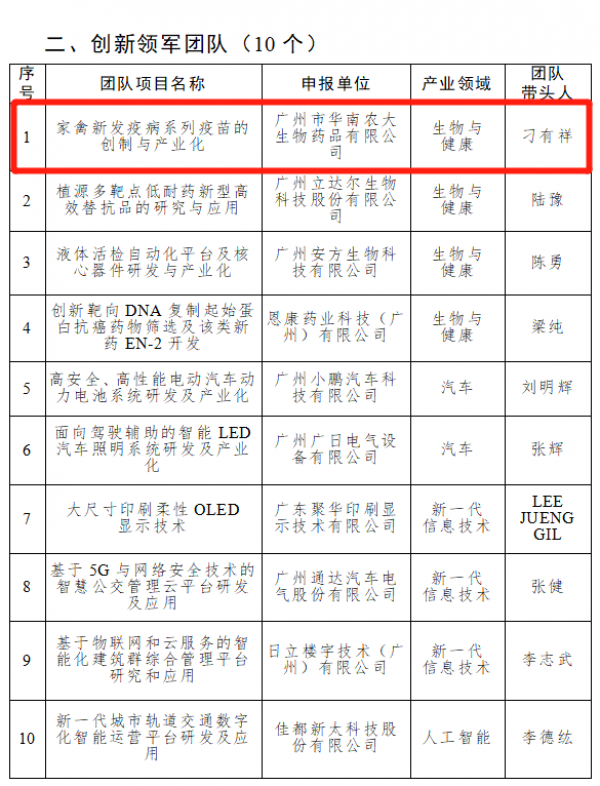 5月23日,2019年度廣州市產(chǎn)業(yè)領(lǐng)軍人才重點(diǎn)項(xiàng)目擬入選人員(團(tuán)隊(duì))公示,按照關(guān)于加快集聚產(chǎn)業(yè)領(lǐng)軍人才的意見相關(guān)規(guī)定,經(jīng)申報(bào)評審各項(xiàng)程序,廣州市華南農(nóng)大生物藥品有限公司擬入選“2019年度廣州市創(chuàng)新領(lǐng)軍團(tuán)隊(duì)”。