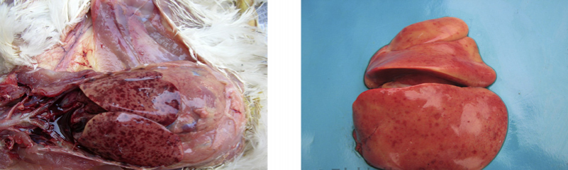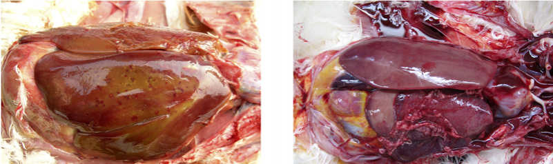 3、禽傷寒:肝臟變成淡綠棕色或古銅綠色,肝臟表面有時有灰白色米粒狀壞死點。